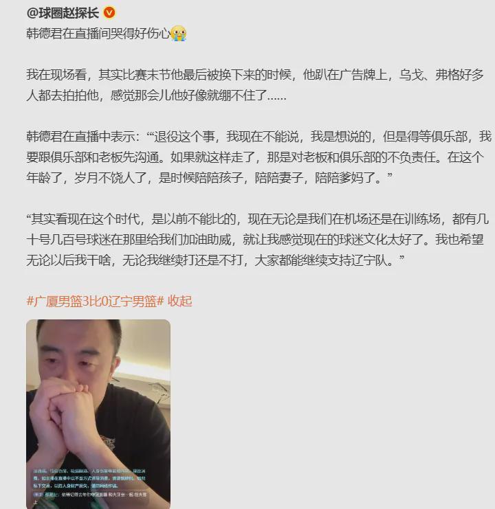 其实早在今年5月初,辽宁队半决赛被广厦队3-0横扫出局的那个夜晚,韩德君在直播中就亲承可能会退役。