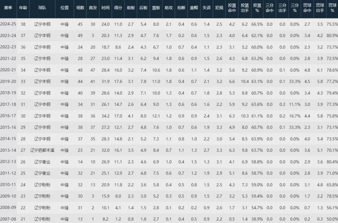 据数据统计,韩德君总共为辽宁队出战600场常规赛,场均砍下12.5分8.1板1.2助;季后赛则出战104场比赛,场均贡献11.4分8.1板1.3助。