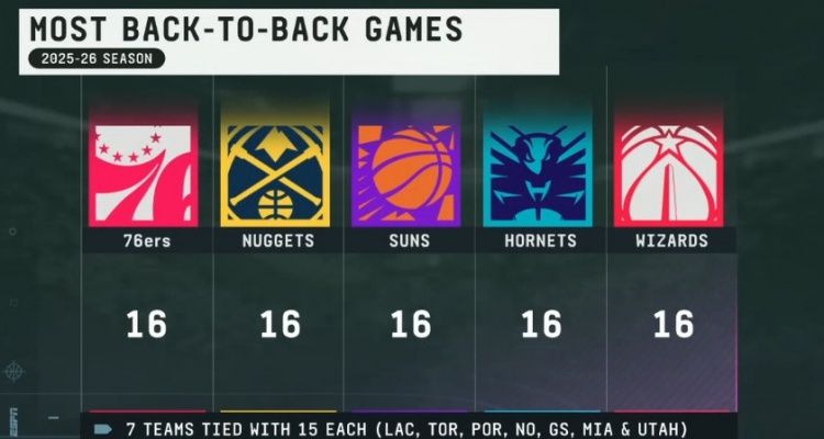 面临16次背靠背赛程的球队包括:费城76人、丹佛掘金、菲尼克斯太阳、夏洛特黄蜂以及华盛顿奇才